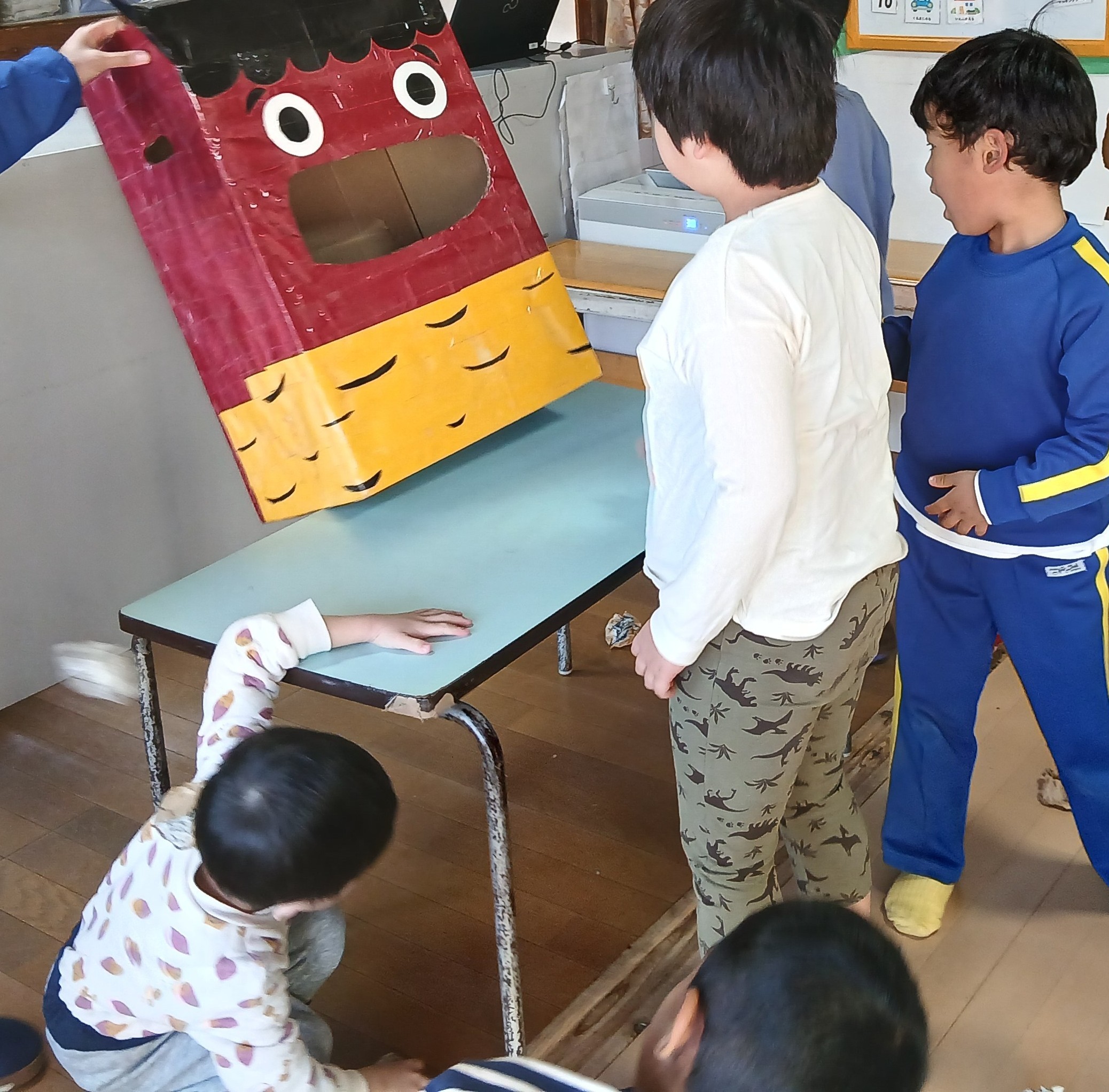2月3日(火)は節分ということで、季節のうたとして「鬼のパンツ」と「まめまき」を歌いました。 その後は、鬼の口に向かって新聞紙ボールを投げ入れる鬼退治ゲームに挑戦... お知らせ