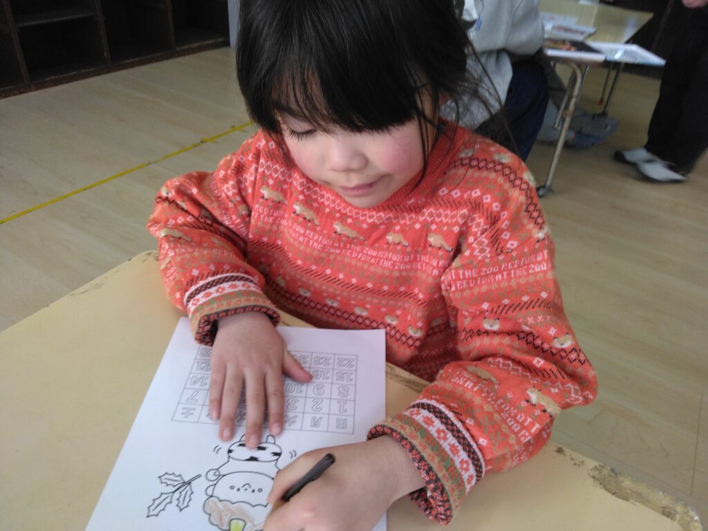 鬼のイラストや日付を、好きな色で上手に描くお子様たち。