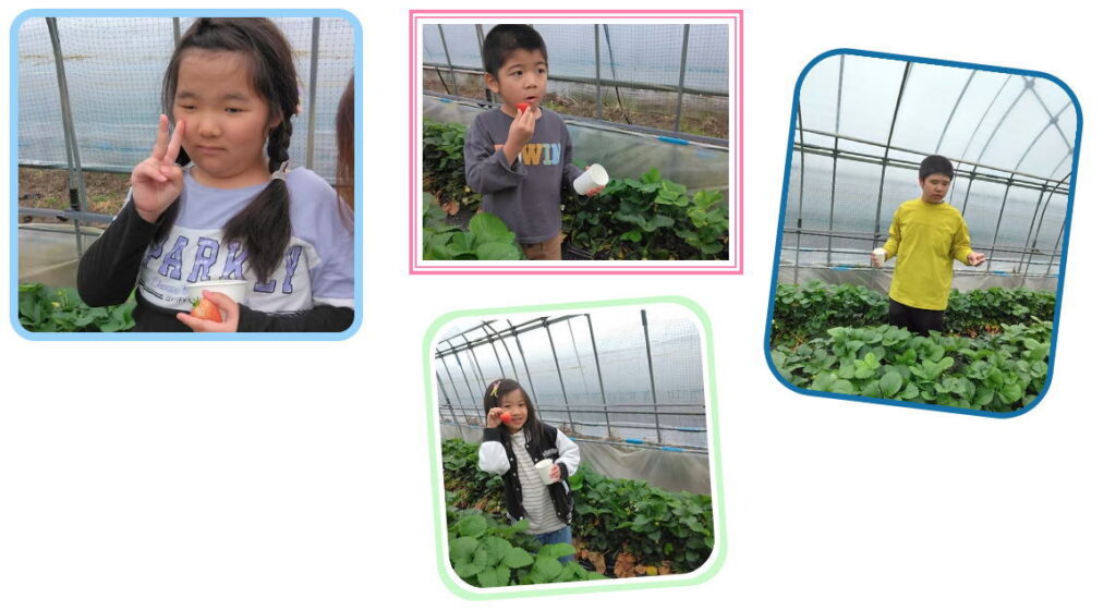 たくさんの赤いいちごに子ども達は大興奮。職員に「見て見て~」とニコニコ笑顔で見せてくれました。お土産の分もあると知り、さらに目を輝かせる子ども達。お腹いっぱいになるまで食べることができました(#^^#)