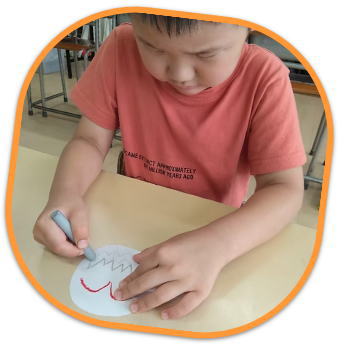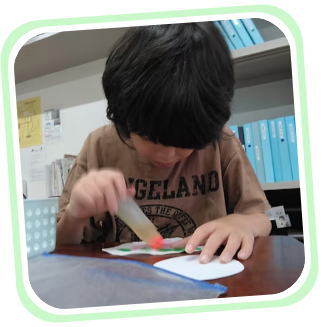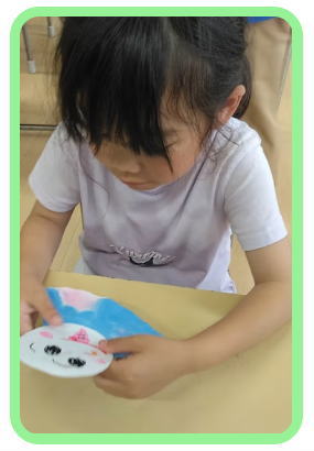 クレヨンでお顔を描き、体に見立てたコーヒーフィルターに筆で絵の具を垂らし、スプレーをかけ色の滲みを楽しみました。お顔には好きなキャラクターや帽子を描くお子さん、「これとこれを合わせたらあの色になるよな…」と考えながら絵の具を付けるお子さん等、可愛いてるてる坊主がたくさん出来上がりました!!