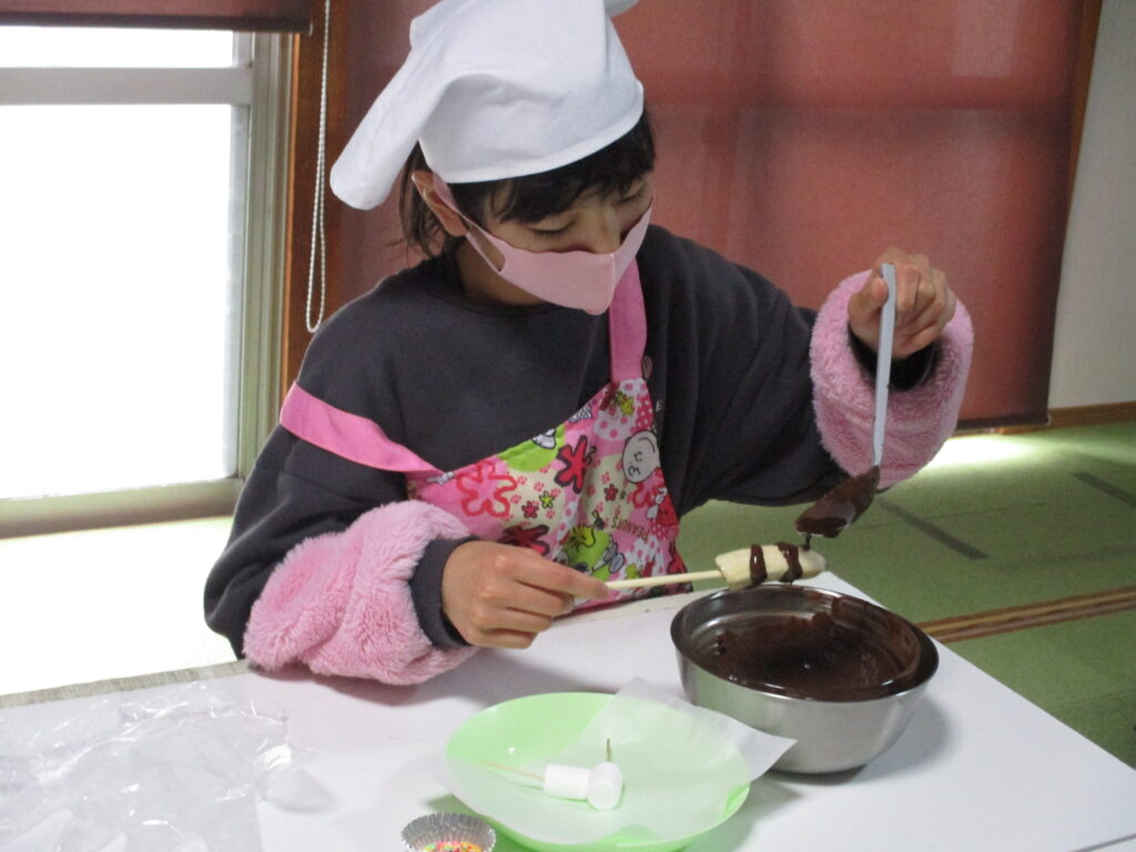 2月14日はバレンタイン!と言うことで、しもだいではチョコバナナとチョコマシュマロを作りました。