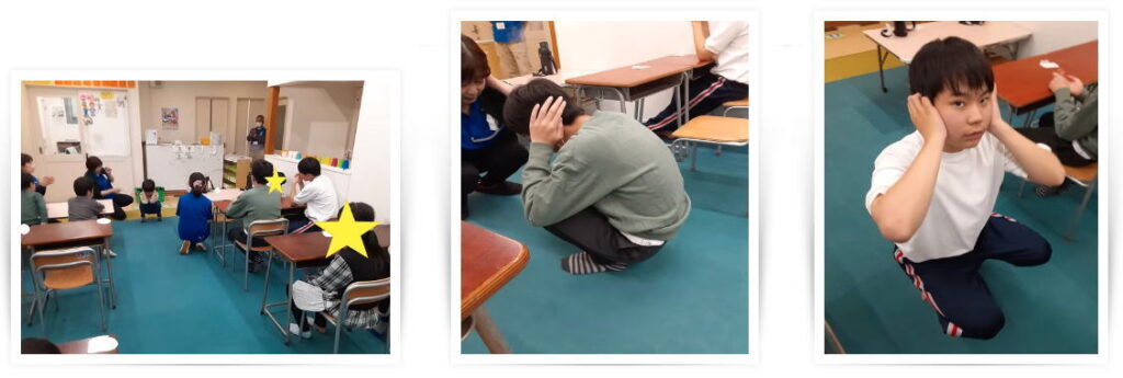 耳をふさいで踵を浮かせながらしゃがむという事を行いました。子ども達もスタッフの説明をしっかり聞いて、取り組むことができました。