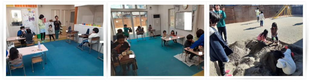 お昼ご飯では、日直のあいさつで一緒にご飯を食べています。
